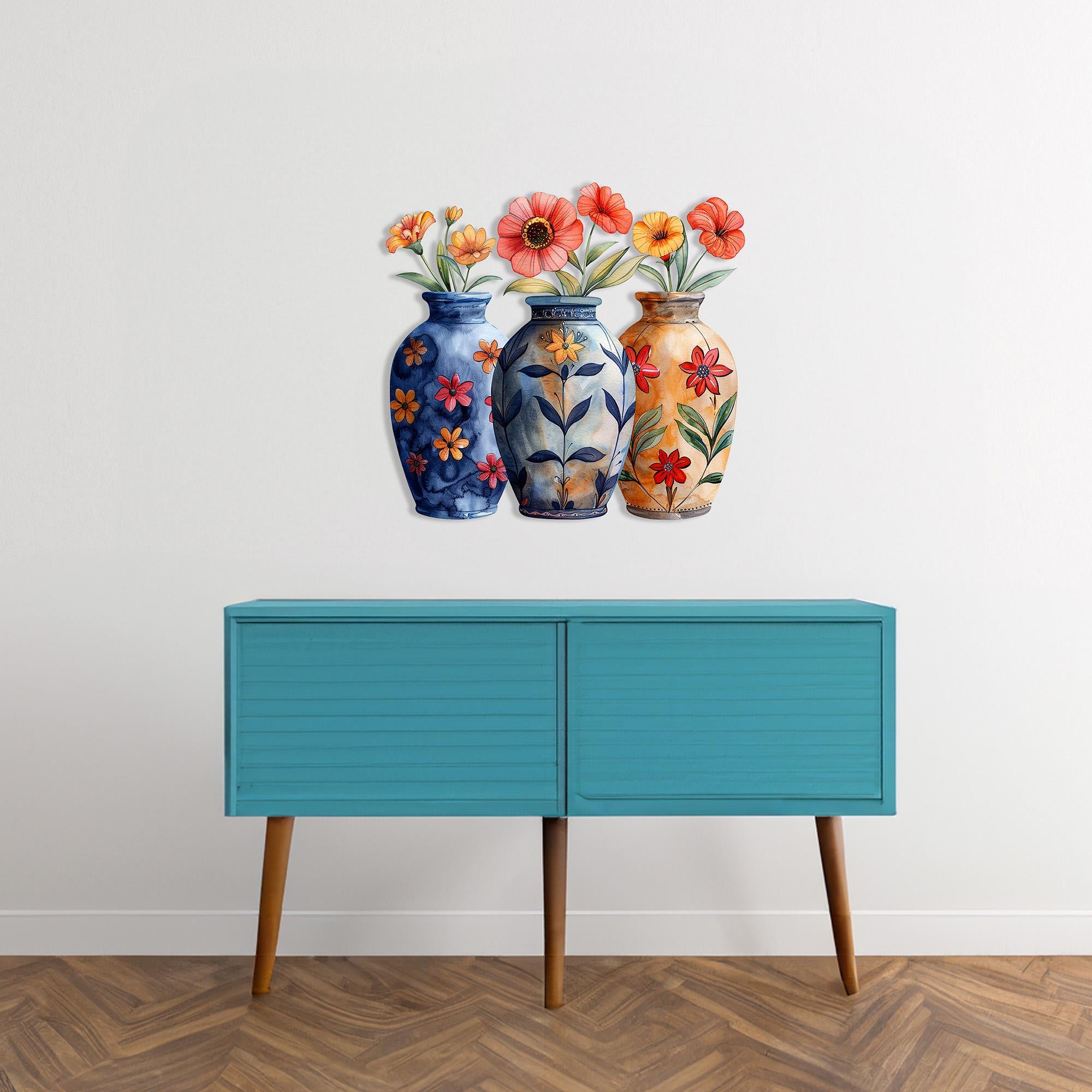 Bring elegance and color to your walls with Trio Bloom, a handcrafted metal wall art featuring three charming floral vases. Precision laser-cut from 2mm durable metal and enhanced with vivid UV printing, this piece is the perfect blend of craftsmanship and vibrant design. Available in two versatile sizes, it brings beauty to any living space, from modern homes to cozy studios.